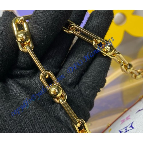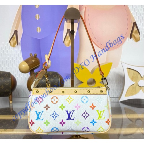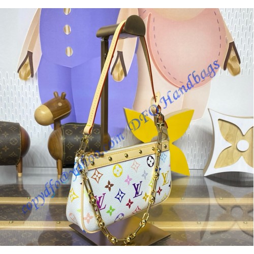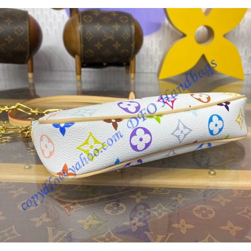 This playful edition of the classic Pochette Accessoires is joyfully reimagined with a multicolored Monogram motif as part of the cross-category Louis Vuitton x Murakami collection. Crafted from coated canvas in a petite pouch shape, a natural cowhide-leather trim adds an emblematic House touch, while golden hardware introduces a chic polished accent. Complete with a removable strap and chain for versatile styling options.