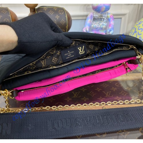 Crafted from recycled nylon in black and rose, the Maxi Multi-Pochette Accessoires belongs to the season’s LV Pillow capsule. This playful piece provides so many styling opportunities: it can be worn cross-body on the long removable strap, carried as a clutch or by hand on its removable chain, with or without the cute detachable coin purse.
