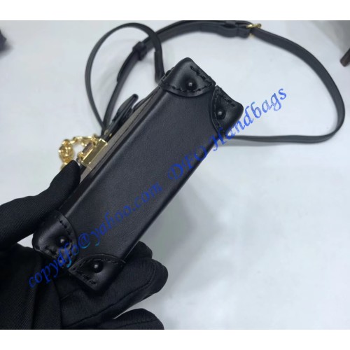 The Pochette Trunk Verticale reinterprets the iconic Essential Trunk small purse in a practical vertical format. Crafted from Monogram canvas and black calf leather, it replicates key details of historic Louis Vuitton trunks, including reinforced corners, an S-lock clasp and a Malletage pattern on the inside pocket. It features a removable, adjustable shoulder strap.