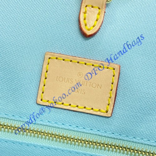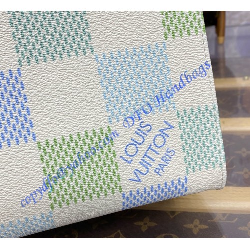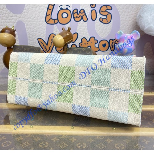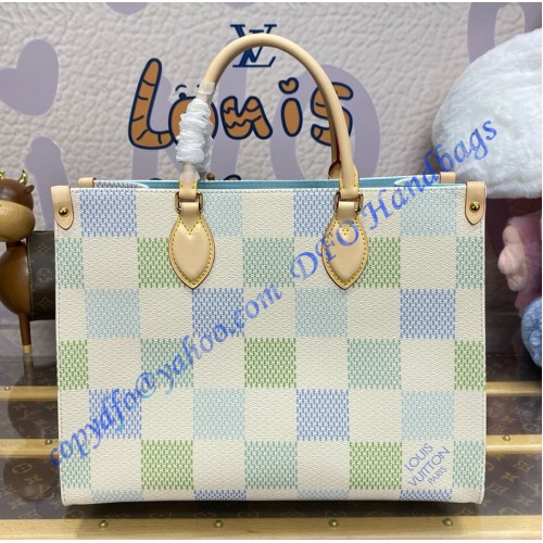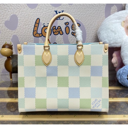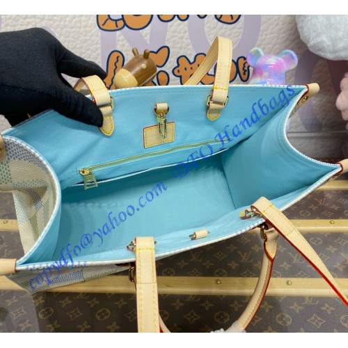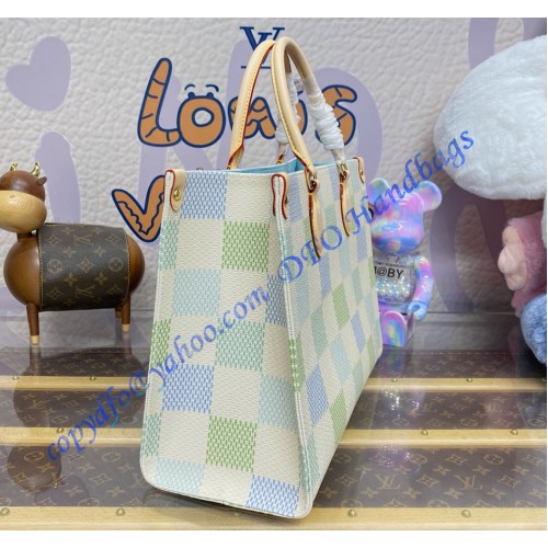 The OnTheGo MM tote bag is made from Damier Giant canvas in a charming colorway that combines four different pastel shades. In addition to two top handles in natural leather, there are two longer straps mounted inside the bag for shoulder carry. Large enough for a 13-inch laptop, this is a practical everyday bag.