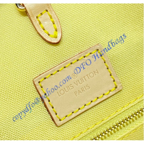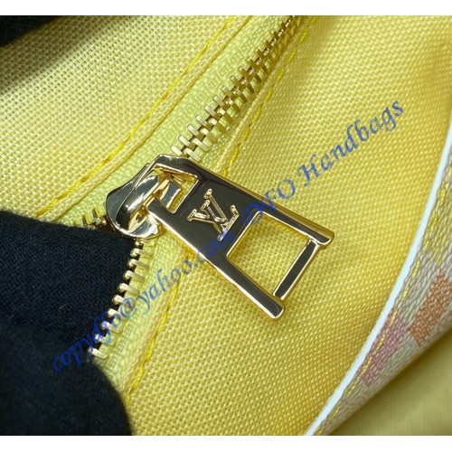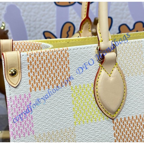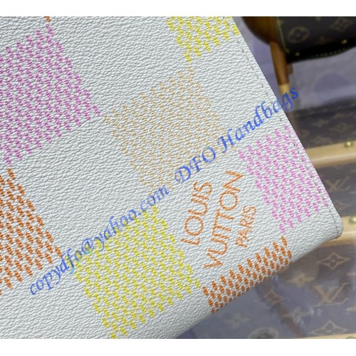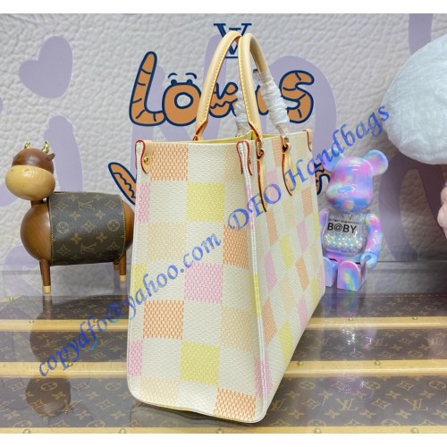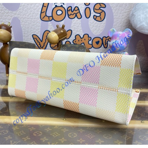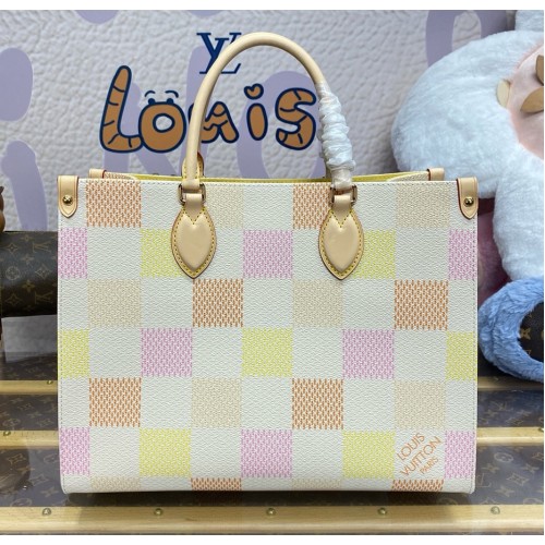 The OnTheGo MM tote bag is made from Damier Giant canvas in a charming colorway that combines four different pastel shades. In addition to two top handles in natural leather, there are two longer straps mounted inside the bag for shoulder carry. Large enough for a 13-inch laptop, this is a practical everyday bag.