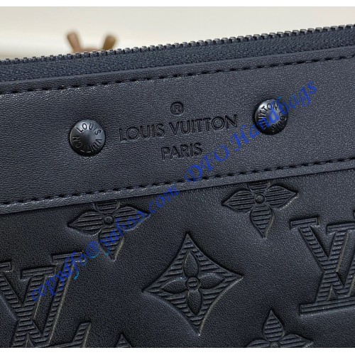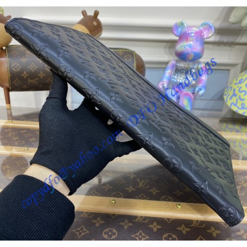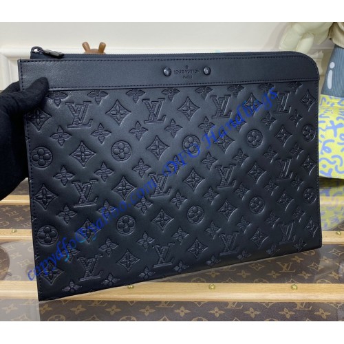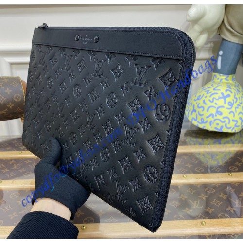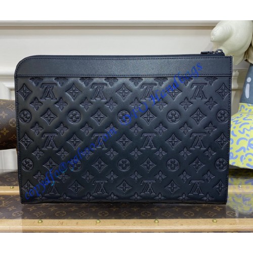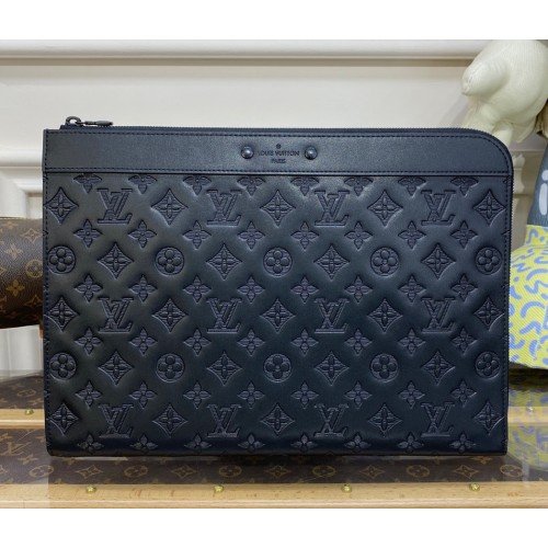 The handsome Pochette Jour is made from supple, black leather and accented with black-color hardware. The leather is embossed with the LVs and Monogram Flowers of the House’s classic Monogram pattern, bringing a luxurious feel to this versatile portfolio pouch. It can easily carry a laptop.