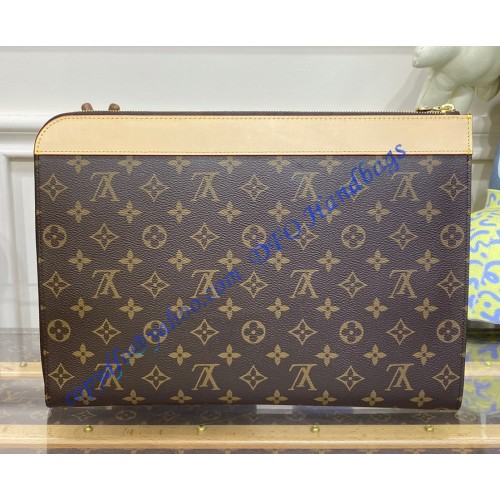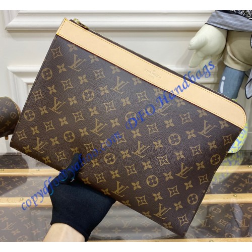 The Pochette Jour pouch is fashioned from Monogram coated canvas with aged natural leather trim and gold-color hardware. The classic Louis Vuitton combination of materials and colors brings a sense of luxury to this versatile pouch. Its wide L-zip opening reveals a simple interior with a flat pocket for valuables.