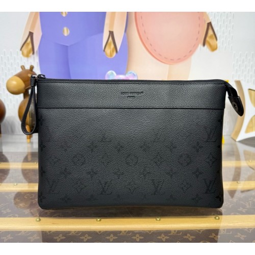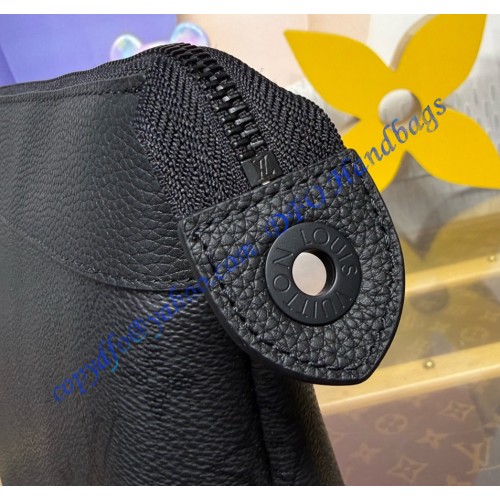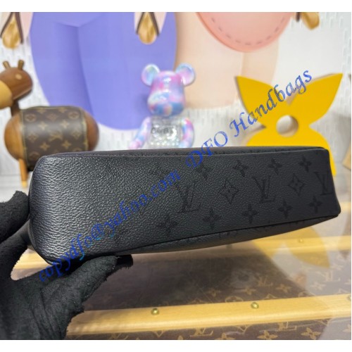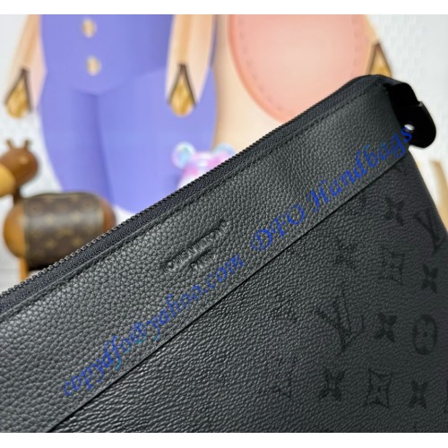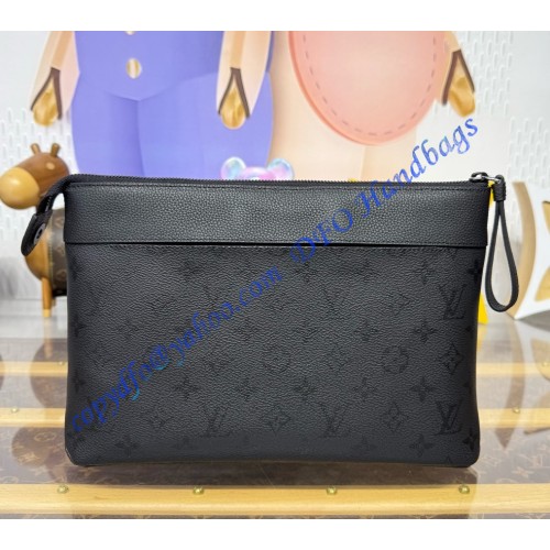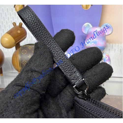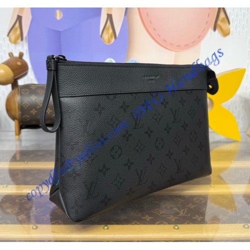 The Pochette Voyage Souple is made from Monogram Midnight coated canvas, featuring a monochromatic motif with discreet Monogram Flowers and LV Initials. This soft pouch has a textile-lined interior and includes a back pocket with magnetic closure. Matte black hardware and a black-leather trim with a slight grain complete the design.