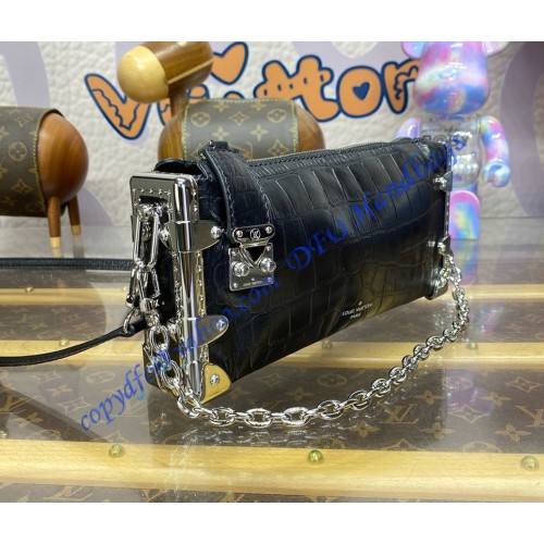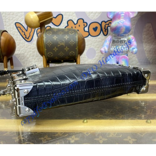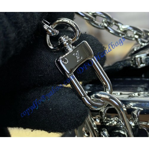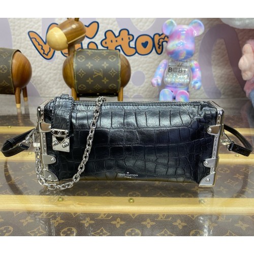 The Slim trunk is a fashion-forward piece that takes its design cues from Louis Vuitton's historic trunks. Crafted from extremely supple calfskin, it is embellished with a riveted frame and S-lock in silver-tone metal, giving it a rock'n'roll vibe. This model offers different carry options thanks to its removable chain and removable, adjustable leather strap.