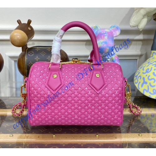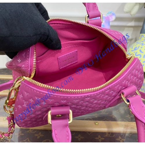 Fashioned from calfskin with a very small Monogram motif embossed then printed on the leather, this Speedy 20 handbag is part of the Nanogram capsule. Its inimitable silhouette, and engraved padlock, make this bag instantly recognizable. A removable and adjustable braided-chain-and-leather strap enables shoulder or cross-body carry.