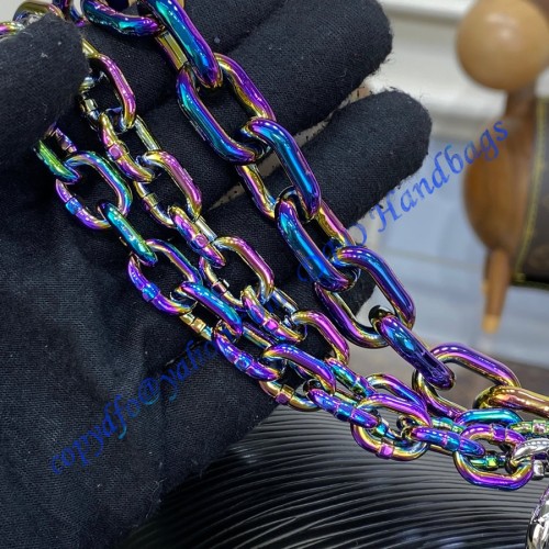 This Twist MM handbag in Epi grained leather is adorned with a unique triple chain that enables hand-carry, but also shoulder and cross-body wear when two of the thin chains are attached to the leather strap. The triple chain and LV Twist lock feature an iridescent finish that makes them shimmer like a scarab beetle.