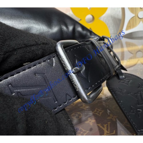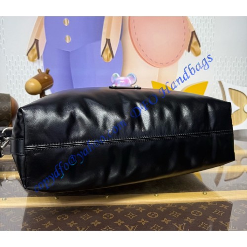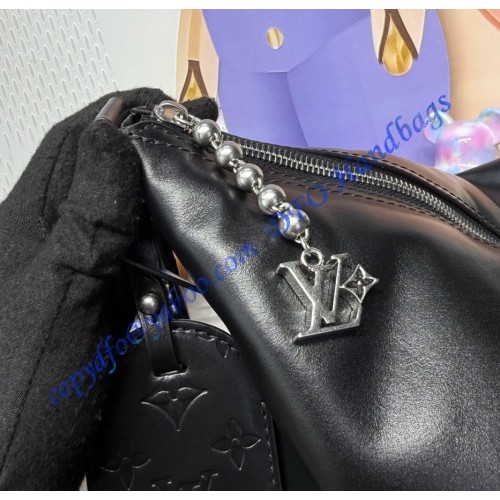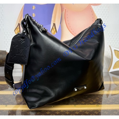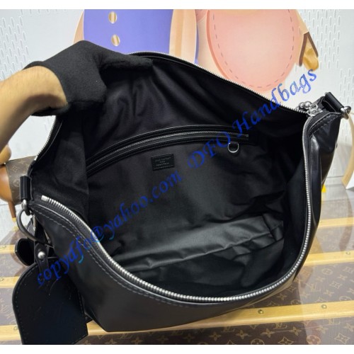 Designed with a masculine edge, the supple Vagabond Hobo bag is made from glossy black calfskin with silver-toned hardware. It is crafted for cross-body wear, or to be carried with its comfortable shoulder strap, and combines functionality with an ergonomic, body-friendly shape. It closes with a zipper, whose zip-pull is attached to ball chain with a LV Initials charm.