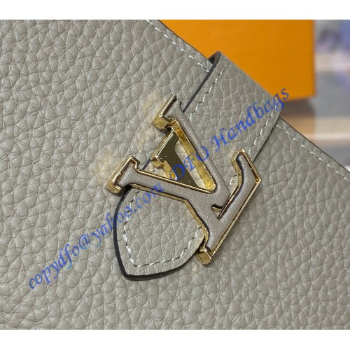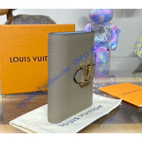 The LV Vertical compact wallet is crafted from grained Taurillon leather, which is complemented by a contrasting lining. This refined design is notable for its sliding LV Initials closure, which references the clasp of the iconic Capucines bag. Its compact format is surprisingly spacious, with features including six card slots and a zipped, gusseted coin compartment.