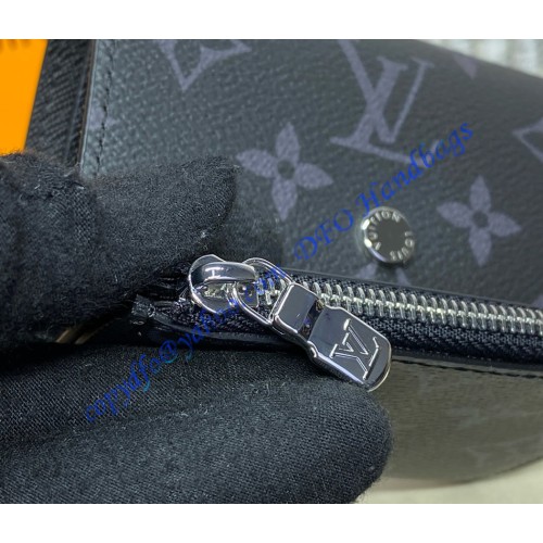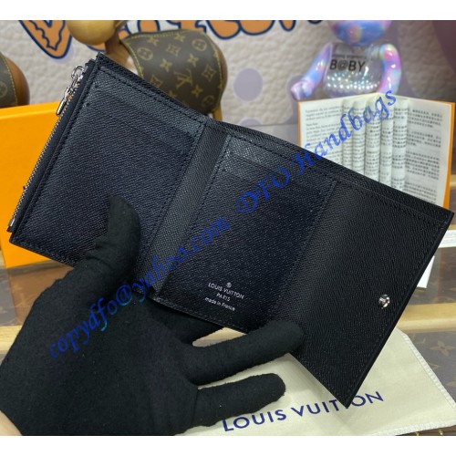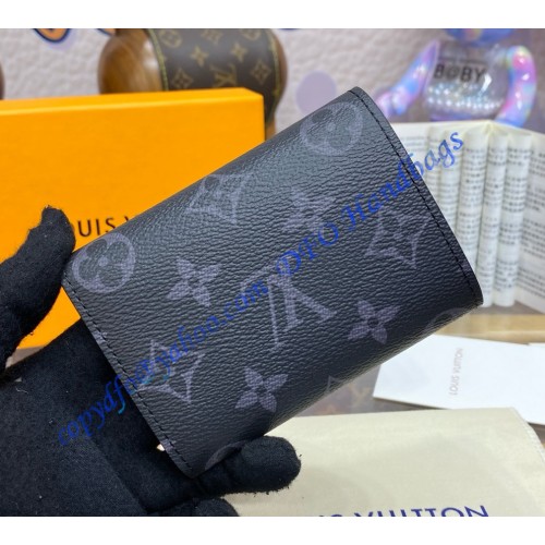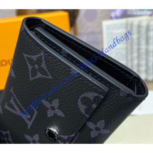 The elegant Victor Wallet in Monogram Eclipse canvas is the practical way to carry coins, cards, bills, and receipts. Unsnap the button closure and this wallet fold out to reveal a pocket for banknotes, five slots for credit or transport cards, and a zipped pocket for coins. The Victor fits easily into almost any pocket.