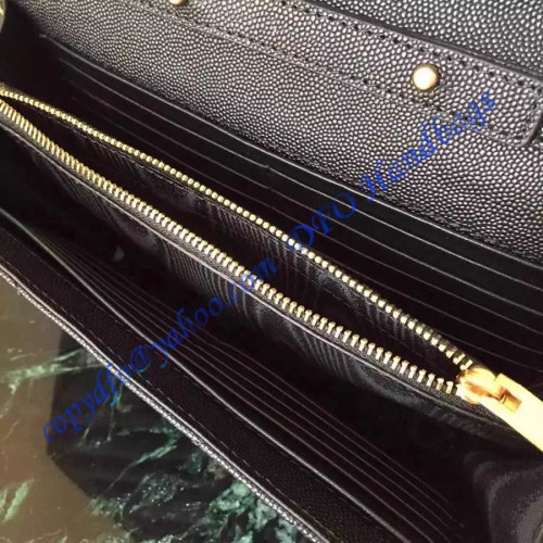 The envelope flap front with YSL logo medallion opens to a matching leather interior with 20 card slots, a coin pocket, 2 bill and 2 receipt compartments, perfect for daily necessities from Saint Laurent!
