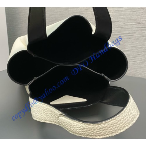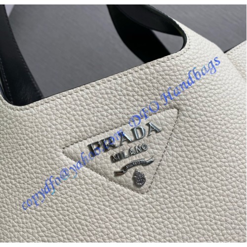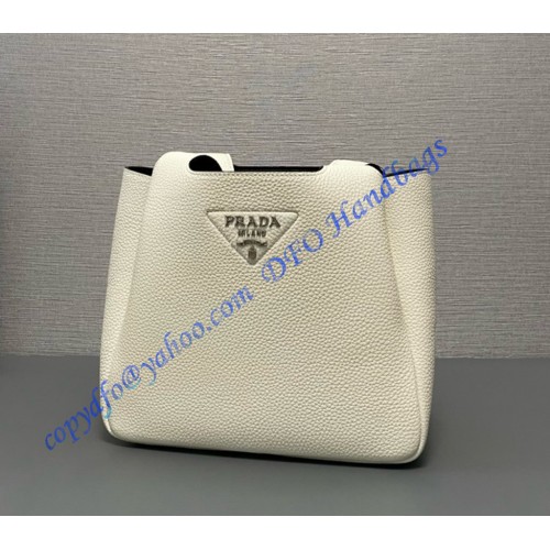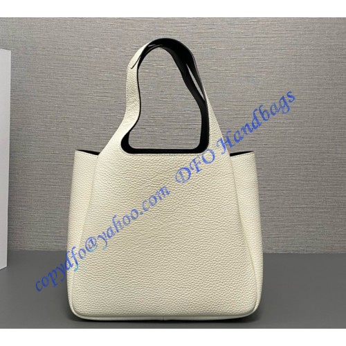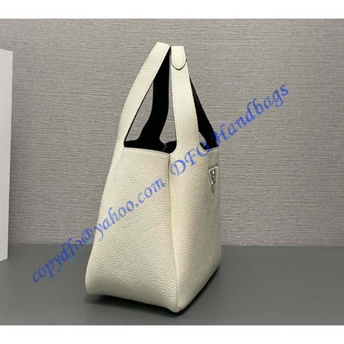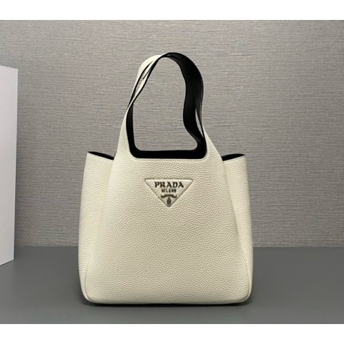 This soft leather tote introduced for the Fall Winter 2020 collection presents a new interpretation of the triangle logo, traced by stitching with the Prada metal lettering logo illuminating its center. The reverse stitching emphasizes the soft, rounded silhouette that comes with a double leather handle and magnetic button closure. The nappa interior has three compartments.