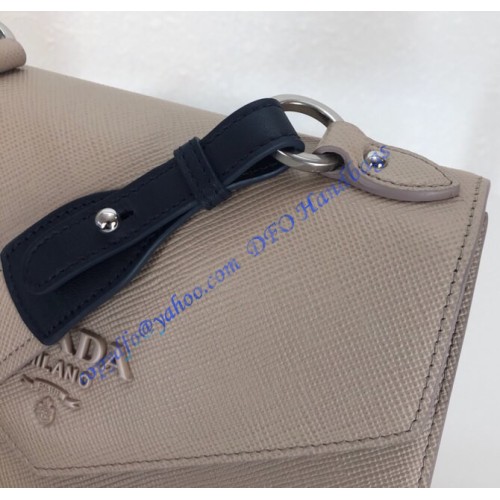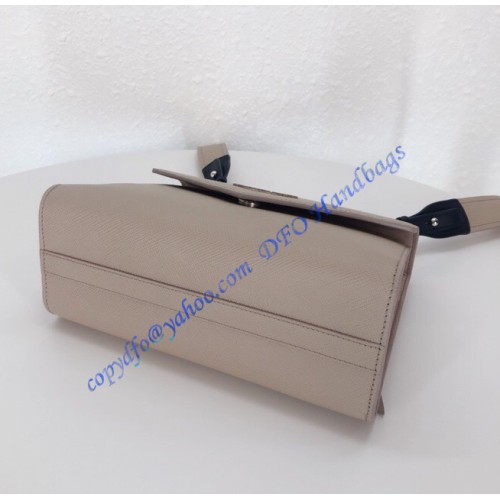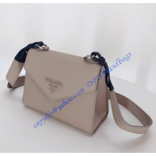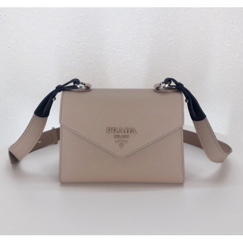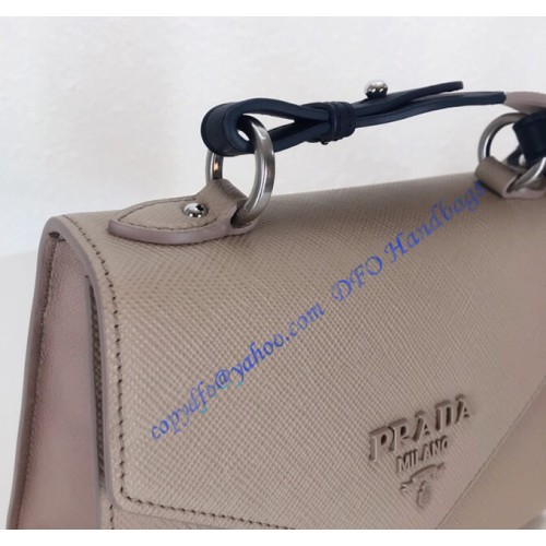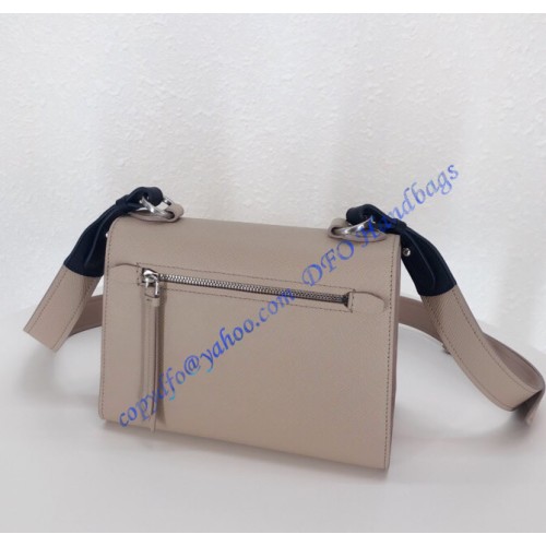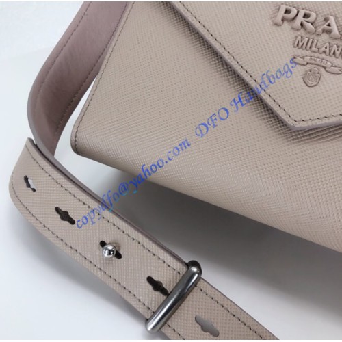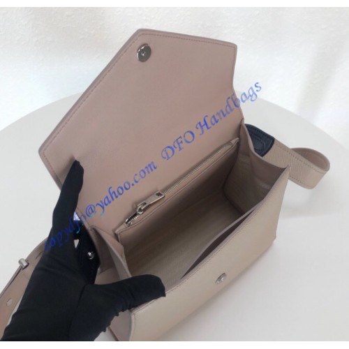 The Prada monochrome Saffiano leather bag in nude pink is 24 cm wide, (9.5 in), 18 cm long (7.1 in), and 11 cm deep (4.3 in).