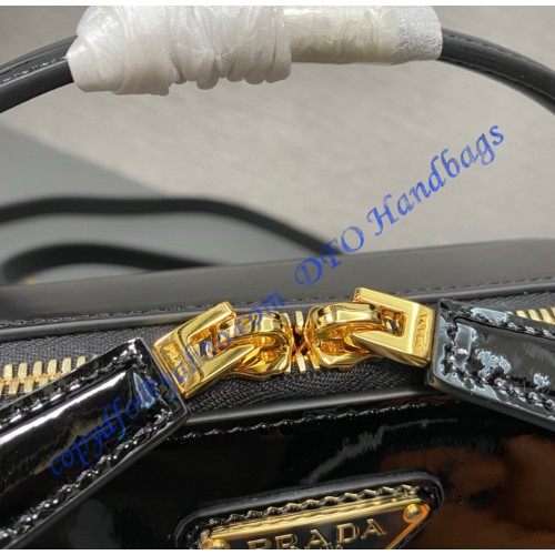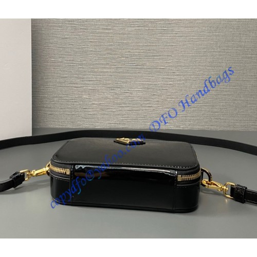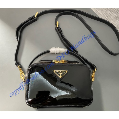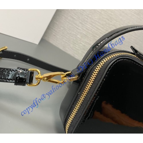 Sleek, elegant lines create this patent-leather mini-bag with a sophisticated character. The versatile, structured design, carried by hand or worn over the shoulder with the removable strap, is completed with a two-way zipper closure and embellished with the enameled metal triangle logo.