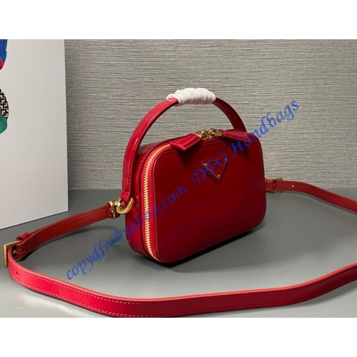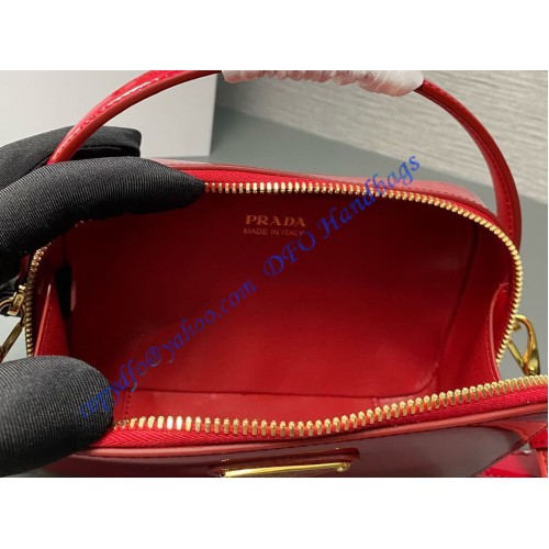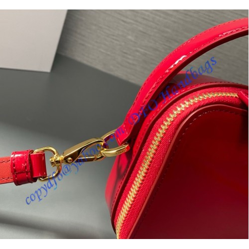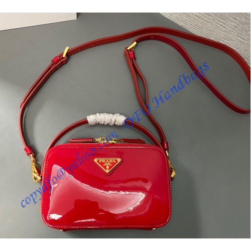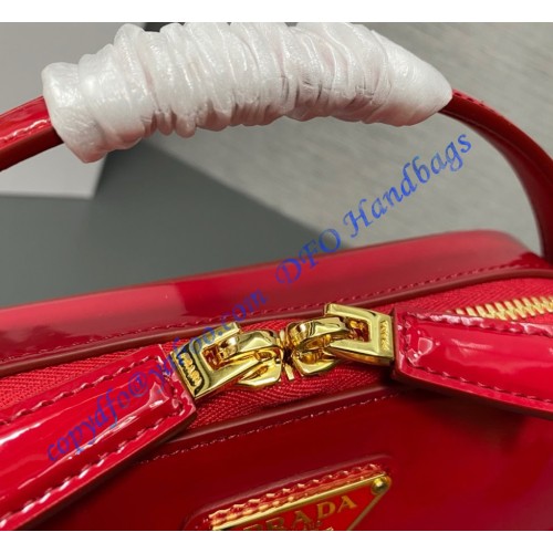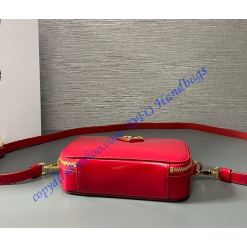 Sleek, elegant lines create this patent-leather mini-bag with a sophisticated character. The versatile, structured design, carried by hand or worn over the shoulder with the removable strap, is completed with a two-way zipper closure and embellished with the enameled metal triangle logo.