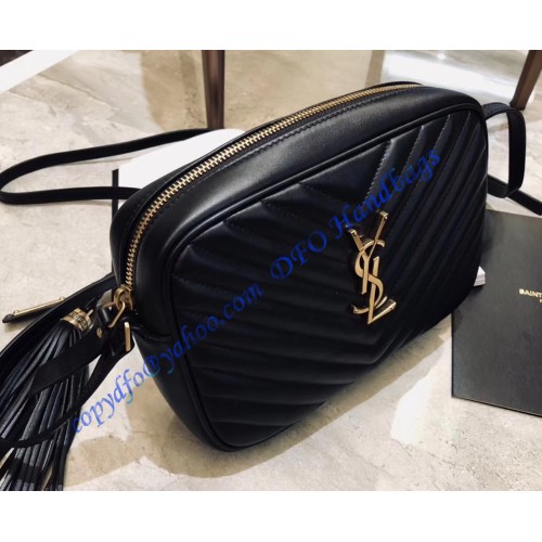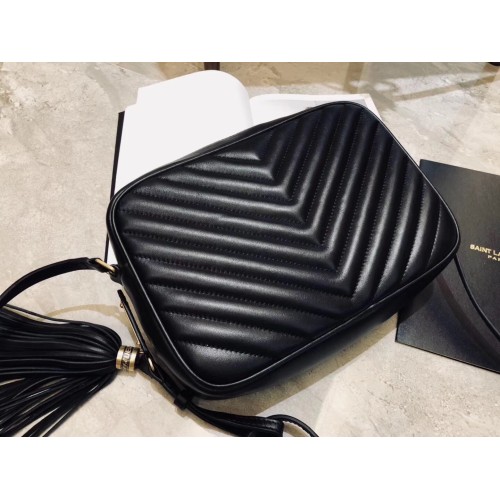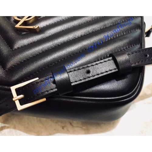 The Saint Laurent Lou camera bag is 23 cm (9.1 in) wide, 16 cm (6.3 in) long, and 6 cm (2.4 in) deep. The shoulder strap drop is 62 cm (24.4 in) long, and it can be adjusted. The bag is black with golden-colored metal sections and is made of durable lambskin.