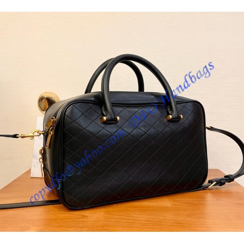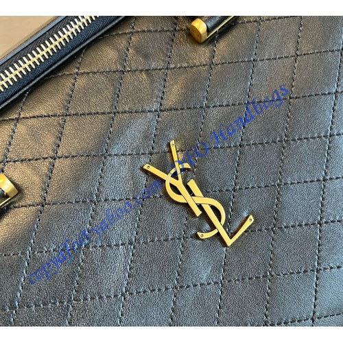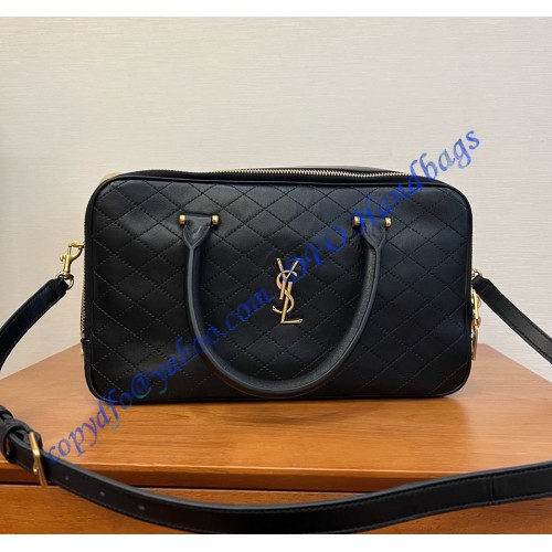 Lyia Duffle Bag in black quilted lambskin with gold-tone metal YSL monogram on the front.